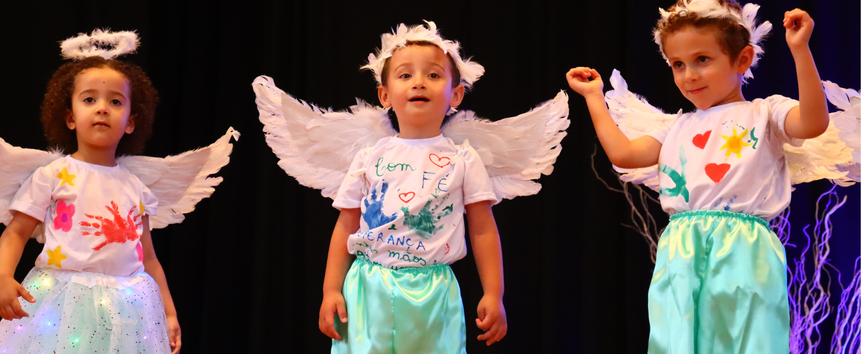 Na Educação Infantil, os pequenos estudantes encantaram os responsáveis e seus pais com apresentações cheias de leveza, sensibilidade e espontaneidade. Por meio de músicas, coreografias e encenações, eles expressaram sentimentos de alegria e gratidão, valorizando o brincar, o conviver e o aprender em um ambiente de acolhida e cuidado.