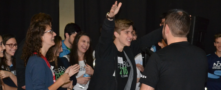 Durante a programação, um grupo de estudantes do Ensino Médio – dividido em duas equipes – participou de um jogo de perguntas e respostas, que exigiu dos competidores conhecimento sobre temas diversos, como História, Geografia, atualidades e música.